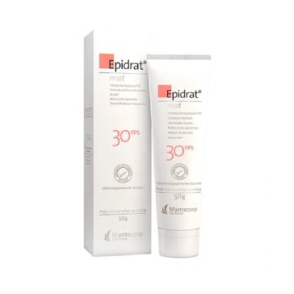 Epidrat Mat é um hidratante facial com com proteção UV, que é indicado para peles oleosas e acneicas, pois possui uma fórmula leve e não oleosa. Controla o brilho, aoleosidade e reduz poros aparentes. Sua fórmula possui uma combinação de ativos hidratantes, antioxidantes e matificantes que controlam oleosidade e o brilho da pele. Com textura leve e fluída, oferece rápida absorção e toque seco. Protege a pele dos raios solares e mantém o aspecto mat (sem brilho) além de reduzir os poros aparentes.