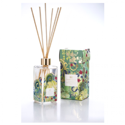 Concebido com o propósito de perfumar e personalizar os ambientes mais requintados, onde a fragrância se espalha harmoniosamente envolvendo o espaço. Embalado em um belo frasco de vidro decorado e com válvula dourada, acompanha uma caixa com belíssima ilustração desenhada a mão e 1 conjunto de 6 varetas, adicionando assim elegância a qualquer ambiente.